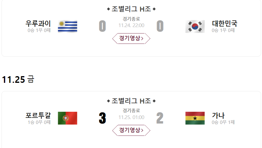 현대 대한민국 피파 랭킹은 28위, 가나는 61위입니다. 전력상 우리나라가 앞서 있는 것은 사실입니다. 그러나 손흥민 선수가 마스크를 착용하고 있고, 김민재 선수의 출전 여부 불투명, 황희찬 선수의 이탈 등 변수가 너무나 많습니다. 현재 카타르 월드컵은 이변이 속출하고 있는데요. 어제 피파랭킹 2위 벨기에가 모로코에 2대 0으로 지는 이변이 발생하였습니다.