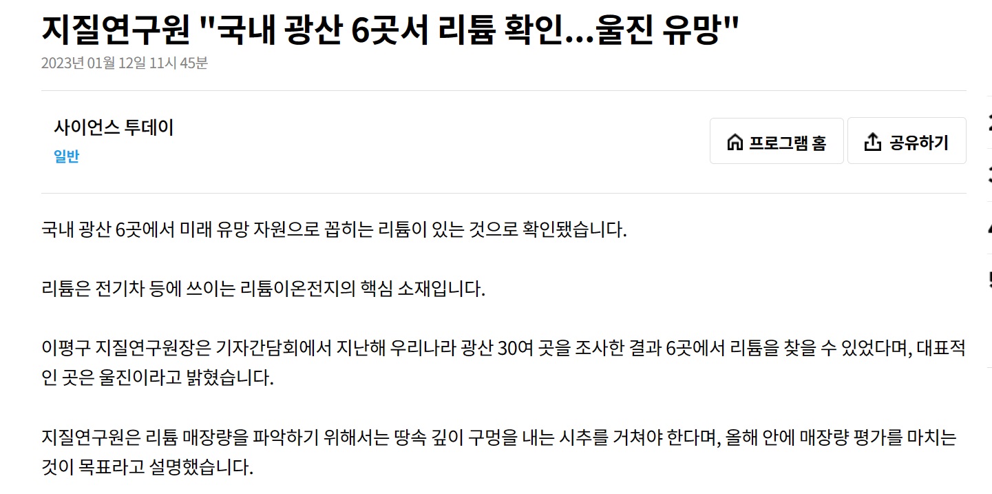 - 지질연구원장이 기자 간담회에서 우리나라 광산을 뒤져보니 리튬을 6곳 정도에서 찾을 수 있었다. 대표적인 곳은 울진이다. 라고 발언하였습니다. 이같은 발표와 함께 지질, 중기계 관련주 및 울진 근처에 본사 또는 공장, 토지 등을 보유한 기업들이 상승하였습니다.