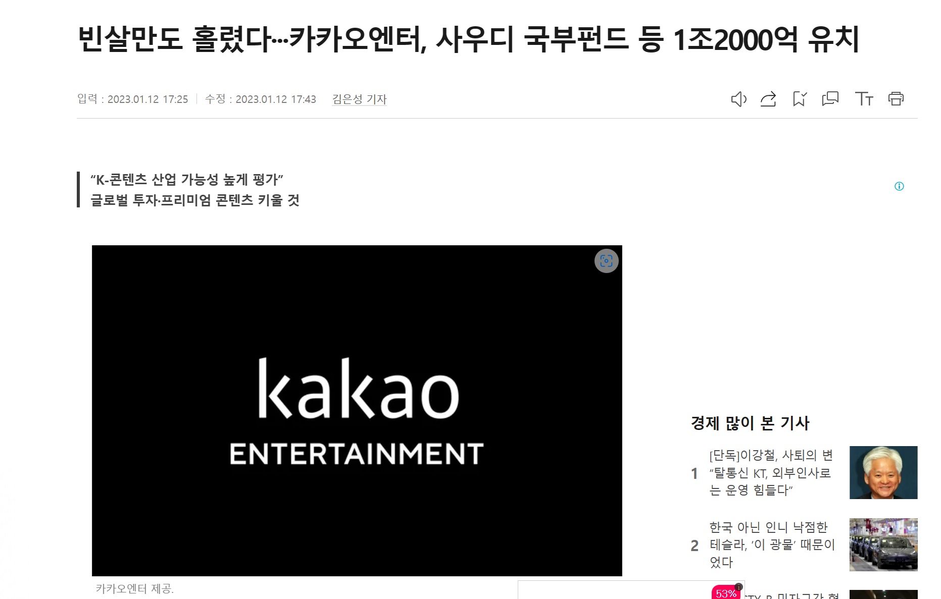 - 카카오엔터가 사우디아라비아 국부펀드 PIF를 비롯한 해외 국부펀드로부터 총 1조 2000억원 투자 유치