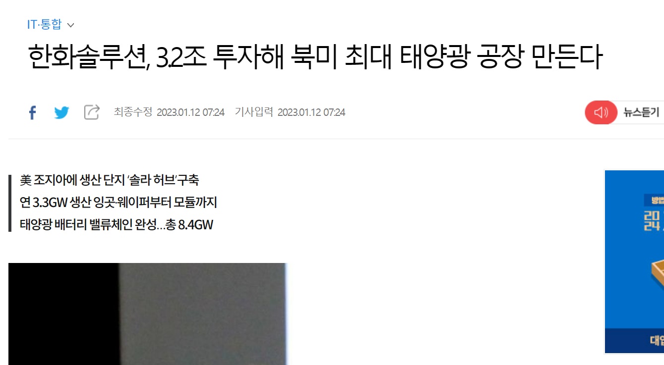 - 한화솔루션이 내년까지 미국 조지아주에 3조 2천억원을 투자해 태양광 통합 생산단지 '솔라허브' 구축