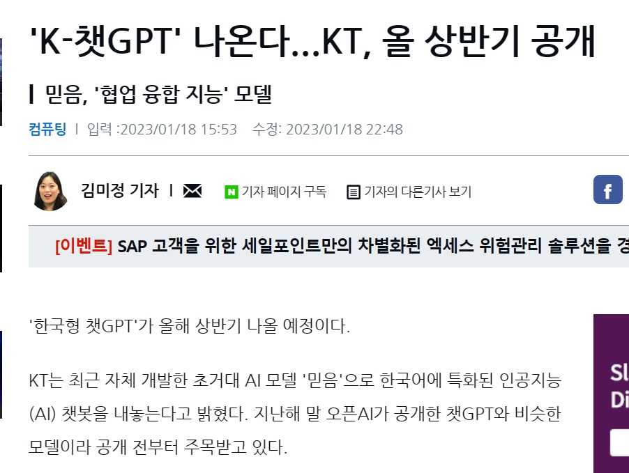 - KT가 오픈 AI의 초거대 인공지능 '챗GPT'와 유사한 수준의 대화형 초거대 AI 서비스를 올 상반기 국내서 상용화를 한다는 소식에 AI 관련주가 지난주부터 이번주까지 무서운 상승세를 보여주고 있습니다.