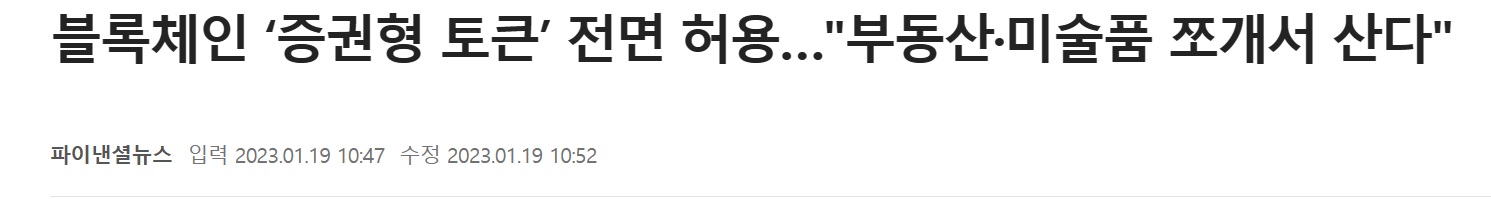 - 블록체인 기술에 기반한 증권인 '증권형 토큰(Security Token)'이 전면 허용된다. 가상자산 시장 제도화의 첫 걸음으로, 부동산·미술품 등에 대한 조각 투자가 가능해질 전망입니다.