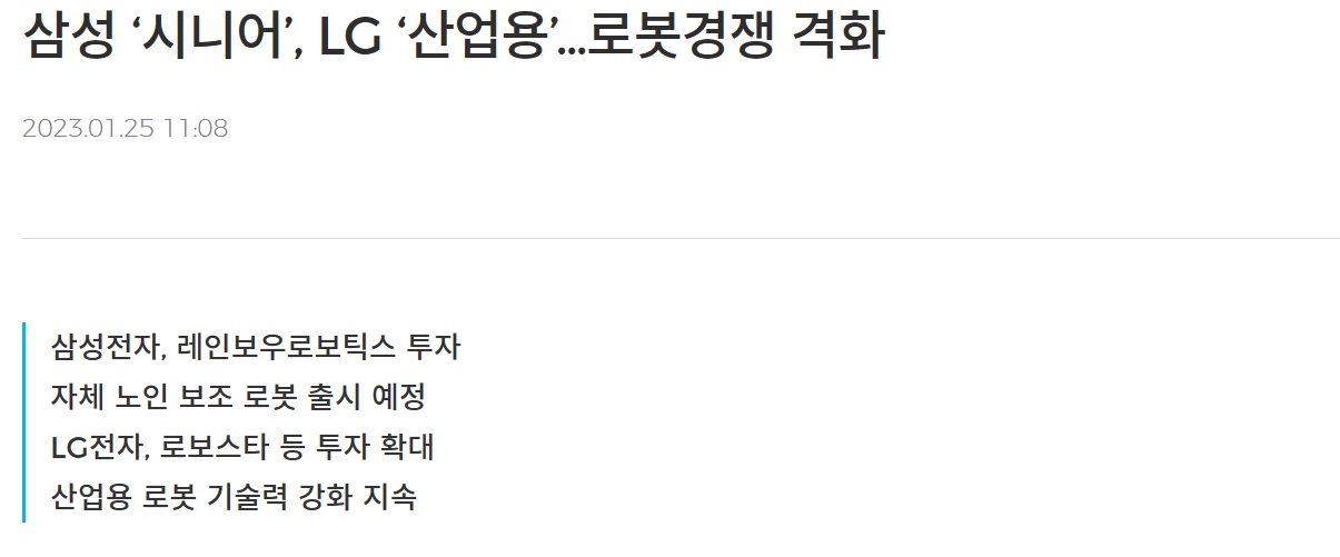 - 삼성전자는 노년층을 위한 보조 로봇을 연내에 내놓겠다는 계획을 발표했으며, LG전자의 경우 산업용 로봇 등에 대한 투자와 기술 개발을 지속하고 있습니다. 삼성전자는 레인보우로보틱스에 지분 투자를, LG전자는 로보스타에 지분 투자를 하고 있는데요. 이처럼 로봇 산업은 추후 성장성이 어마어마 합니다.