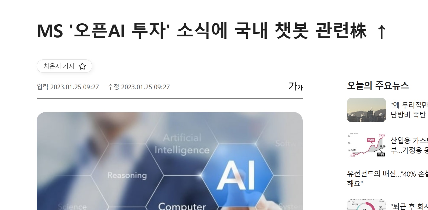 - 마이크로소프트가 인공지능 챗봇 개발사인 '오픈AI'에 대한 새로운 투자 계획을 발표하며 AI 관련주가 크게 상승 하였습니다.