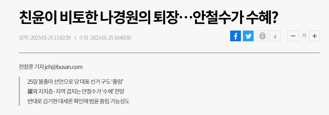 - 여론조사 결과 안철수 vs 김기현 양자대결 49.8% 대 39.5% 로 나왔다고 합니다. 이와 더불어 나경원이 전당대회 불출마 선언을 하면서 안철수가 수혜를 볼 것이라는 기사와 함께 안철수 관련주가 상승하였습니다.