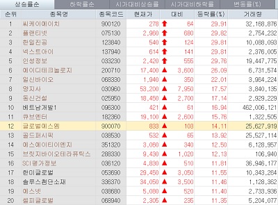 오늘 상한가를 기록한 플랜티넷은 인터넷 서비스 관련주로 카카오 사태와 더불어 북한 해킹 소식이 전해지면서 보안 관련주로 엮이며 상한가를 기록하였습니다. 한미글로벌은 국토부 장관이 11월 초 사우디 방문 추진 소식이 전해지며 네옴 시티 대장주로서 상승을 한 것으로 보입니다. 그 외 눈에 들어오는 종목은 별로 없습니다.